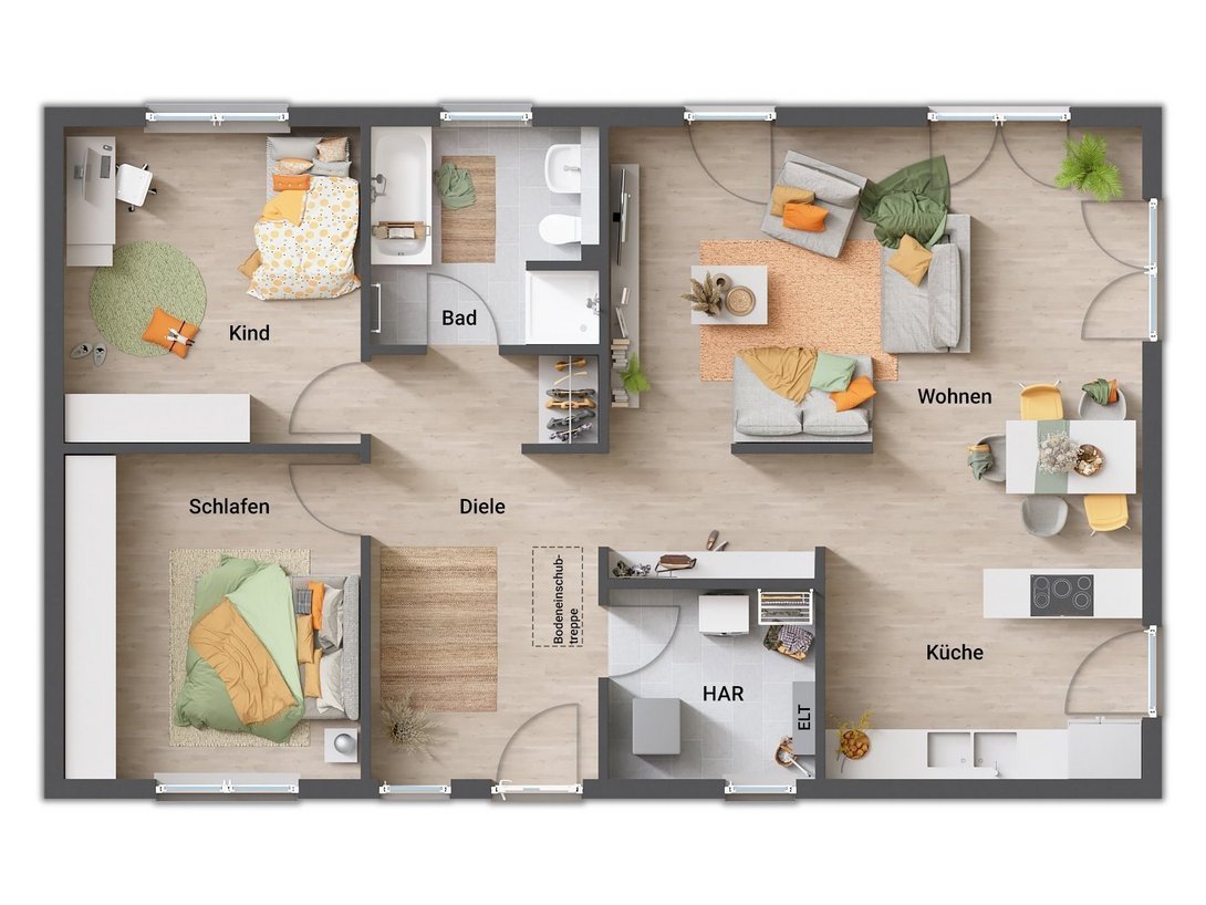 - Fußbodenheizung: Warme Füße? Auch die Fußbodenheizung ist inklusive. Sie steigert nicht nur den Wert Ihres Hauses, sondern sorgt ganz nebenbei noch für echtes Wohngefühl.