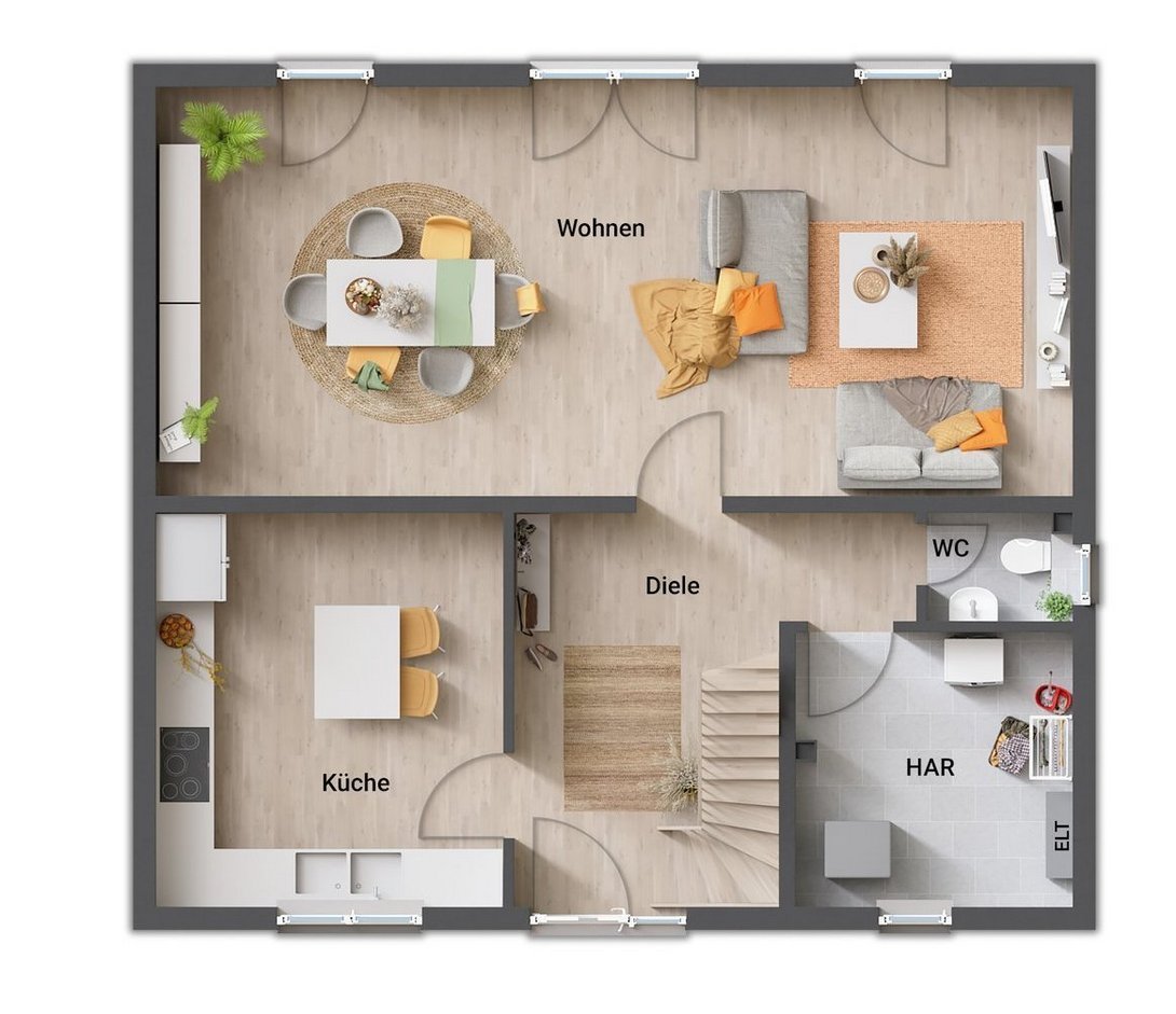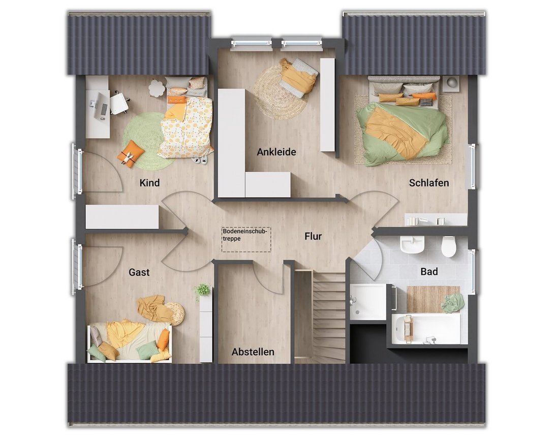 Dieses Haus wird als Niedrigenergiehaus nach den Vorgaben des GEG 2024 (Gebäudeenergiegesetz) gebaut, die Abbildungen enthalten teilweise Sonderausstattungen.
