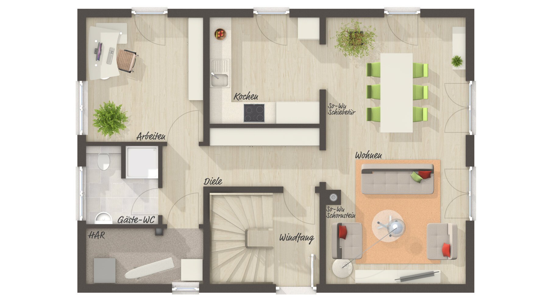 Bauherren sind dank bodentiefer Fenster, klassischer Architektur und individuellem Grundriss vom Bodensee 129 begeistert. Dieses Massivhaus ist das ideale Zuhause für Familien mit Kindern. Angefangen beim Erdgeschoss mit großzügigem Wohnbereich, halboffener Küche und Home-Office bis hin zum Dachgeschoss mit Schlafzimmer inklusive Ankleide, Kinderzimmer sowie Gästezimmer. In diesen vier Wänden genießen Sie Freiraum und Individualität in vollen Zügen. Denn dieses Einfamilienhaus kann sich Ihren Bedürfnissen und Wünschen jederzeit anpassen, ob weitere Kinderzimmer oder zwei Büros im Eigenheim. Im Bodensee 129 sind Ihnen keine Grenzen gesetzt.